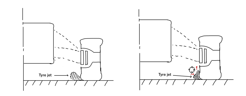 例えばフロントタイヤの接地面から生じるジェット気流の制御を考えてみよう. タイヤの接地面からのジェット気流は, 大きなCpTの損失を伴うため, 後方のデバイスのためにも, できるだけ外側に気流の領域をとどめておきたい. そこで反時計回りの渦をこのジェット気流の斜め上に配置したとして, どのように流れ場に変化があるかを考えてみる. 下図にフロントタイヤのジェット気流の様子を渦なしとありの状態で示す. 渦がない状態では, タイヤの接地面から内側の方向にジェット気流が膨らむ一方で, 渦があることで気流の領域に外側と上側成分の速度が加わり, 結果としてジェット気流をより外側にとどめておくことに成功している. F1で当時活発に使用されていたY250の渦もその機能の1つとしてタイヤ周りの気流制御が挙げられる.