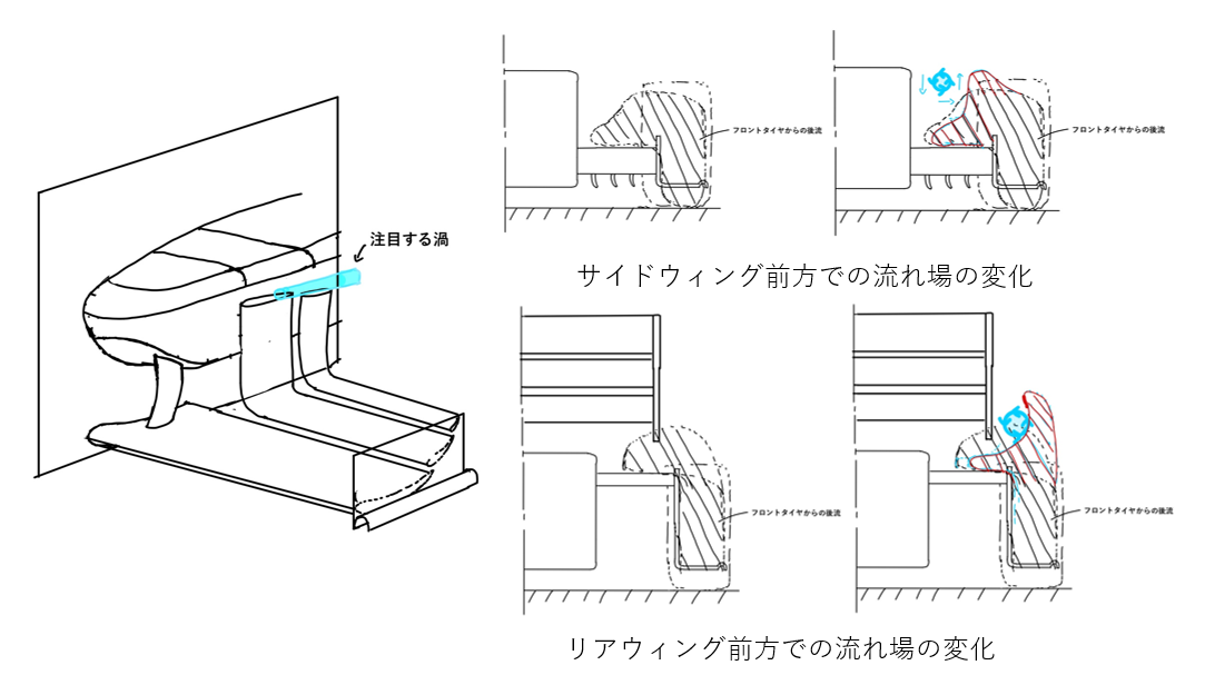 もう1つの例として, 近年学生フォーミュラの一部で採用されている, フロントウィング内側のoutwash sweepという形状が後方に及ぼす影響について, 渦の観点から考えてみる. outwashのdetailによりフロントウィングのダウンフォースも大きく増大するが, 今回はフロントウィングの空力的な変化については省略する. CFDのデルタではないのでその分信憑性は薄いが, 自身の経験上流れ場がこうなるという考えのもとで以下の議論を進めていく.