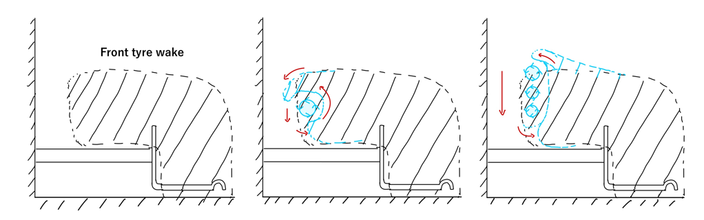 この現象をより分かりやすく形状として落とし込んでみる. 圧力差が発生しているということは上面と下面, もしくは右面と左面で流れ場が異なるということを意味するので, 流れを曲げようとするような板や翼が必要だと分かる. 2022年以降のフェンス形状を見ると明らかなように, 前方からの流れを, より外向きの流れ, Outwashに変換するようにフェンスを配置することで, 外側は高圧, 内側には低圧な状況を作り出し, その圧力差でフェンスの下の縁より生じる渦でダウンフォースが強化されている. 渦の向きは高圧から低圧に向けて巻くため, この原理を理解していると, 自分の欲しい向きに渦を発生させたい場合, どっち向きに板, 及び翼を付けるべきかが明らかになる.