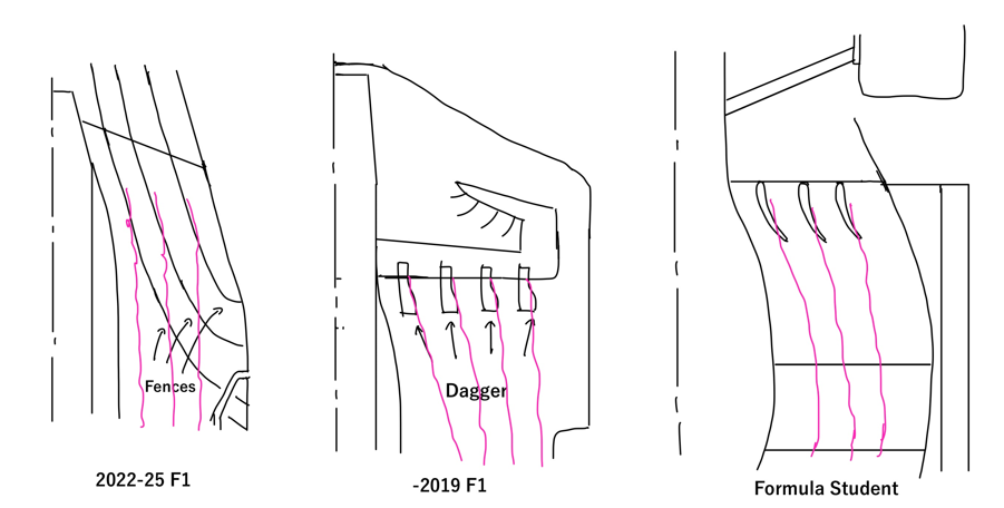 F1のフロア前方でのダウンフォースを発生させる手法としてもこの原理が用いられている. 2021年以前のフラットフロアではY250ボルテックスとバージボード, またフロア前縁のボルテックスジェネレータ(このデバイスはdaggerやclawと呼ばれる)を用いて, 2022年以降の3D形状のフロアであればフロアフェンスとフロアの形状をコントロールして渦の強さと数, そしてトポロジーをコントロールして, 前方のダウンフォースを発生させている. 学生フォーミュラでも近年特にヨーロッパのチームを中心に, 渦を用いてサイドウィングのパフォーマンスを向上させる狙いで大小さまざまのボルテックスジェネレータを使用しているチームがみられる. 以下にそれぞれの形状のスケッチと, ピンクの線で大まかな渦の様子を記した. なおピンクの線はあくまで渦の挙動を大まかに理解するための補助として書き込んだだけで, 実際にこのような渦の軌道をしているわけではない.
