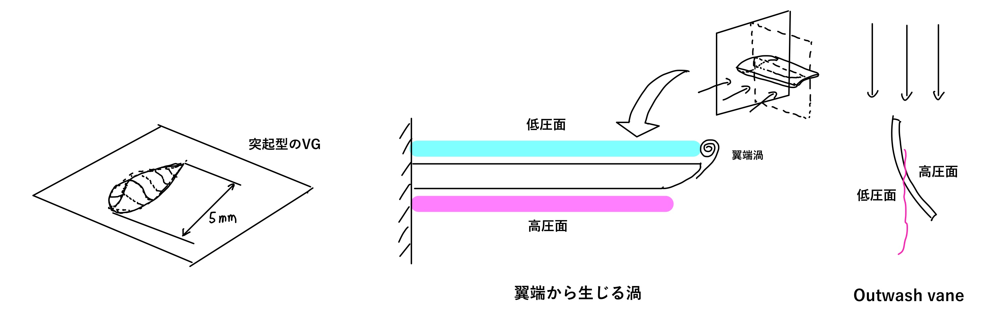 よくボルテックスジェネレータというと小さい突起状のデバイスを意味することがあるが, 渦を発生させるために必要な条件とは何か. これは翼端渦の発生の原理をもとに考えると分かりやすい. 渦が生じるのは1点, もしくは流れ方向の線上に強いせん断流れが発生したときであり, 翼端では上側と下側の圧力差によって翼の物理的な面がなくなるタイミングでせん断流れが生じる. このせん断流れはスライスで見ると点で生じるため, 後流に行くにつれてこのせん断流れは渦となる. つまり渦を物理的に必要な条件は, 局所的なせん断流れを発生させることであり, これには圧力差をもった面を作ることで, 面の縁から渦を発生させることができる.