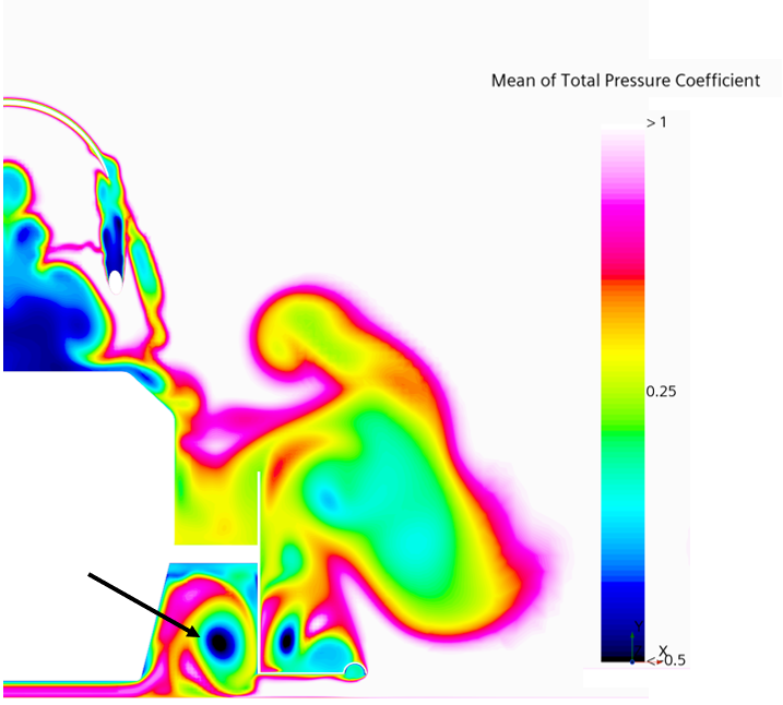 以下に学生フォーミュラのサイドウィングの前方からの渦が, 逆圧力勾配下でBreakdownを起こしている様子を記す. この渦は比較的うまくマネジメントされている方で, 内側に高CpTのupwashが見られるように, この状態でもある程度生きているが, その中心部のCpTは周りと比較して非常に低下している様子が分かる.