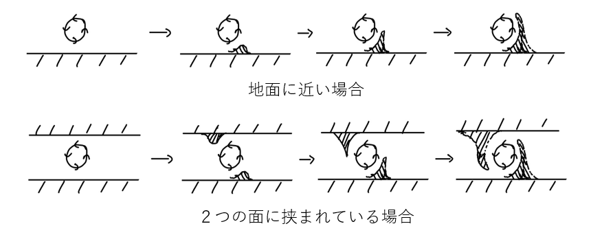 渦と近くの面の境界層によって生じるロスの巻き上げ